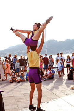 “Atempo” es una obra de circo-teatro que presenta comedia física, portes acrobáticos, tiro al blanco y manipulación de objetos. Un espectáculo para todo público que prescinde de la palabra, logrando así una pieza de entendimiento universal y de carácter popular.